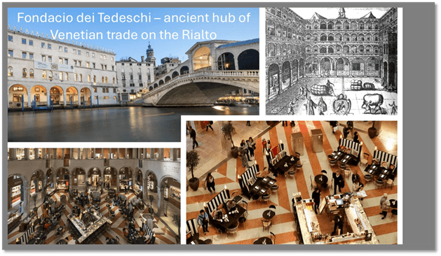 This is the experience of existence in time featuring the dynamic between the pull to the past that is Heimlich against the Uncanny / Unheimlich of the future. Yet to the latter we must flow though it will take Orsola five centuries to do so. And in Venetian terms this means this particular transport of her first sale of commodities in the watery ‘stream of people’ that ‘spat her out in front of the Fondaco dei Tedeschi, the home of Venetian trade and the hub of international capitalist relations as an idea,