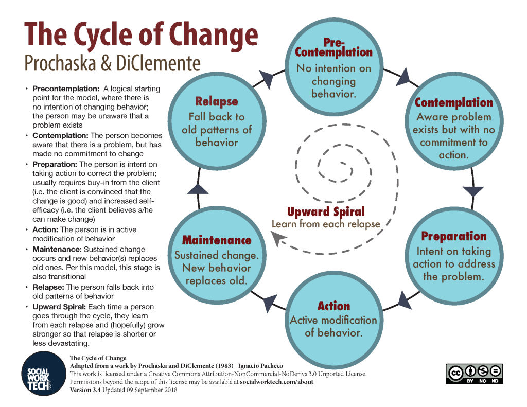 The model of behavioural change promoted by Prochaska and DiClemente to describe the usual process of escaping addiction provides the best model of how success occurs and is more durable in nature. It applies to any human behavioural task and suggests that only when serial occurrences of apparent failure in the task occur (failures which the model calls RELAPSE) can lasting success be expected.
