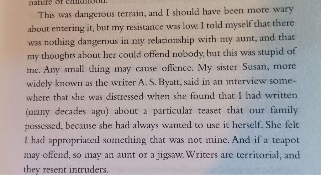 Drabble’s version of the competition between the sisters takes the form of Susan’s anger (her first name was originally Susan and Byatt was furious when her American publishers translated her name on the American first edition of one of her novels to ‘Antonia Susan’. Susan, she thought, was not their possession to use, any more than her sister had right to use a memory of a tea-set that she coveted to use. The family possessed it but did either daughter have the right of possession after their parents’ death. The problem with possession, even by family memories, is that they distort identity into forms that are intrinsically about competitions over possession.