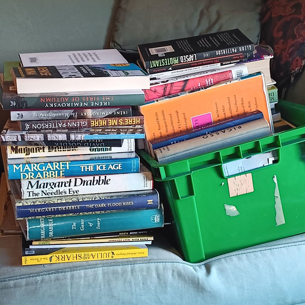 Back then to dispossession of my library. Below is the storage of books I have sadly let out of my possession and which the compant The World of Books won’t give even their usual remittance of 20 pence each for. Clearly there is no market. I do not want to be influenced in my qualitative judgements by the market so I am glad I only learned this once I let them go. I let them go not because they aren’t great books to my mind but because to hold on to them merely because they mattered to you once is a sad business. It is a refusal to grow in your evaluations beyond initial judgements and decisions. These books may return to general appreciation but it will be a communal decision if they do and not yours.