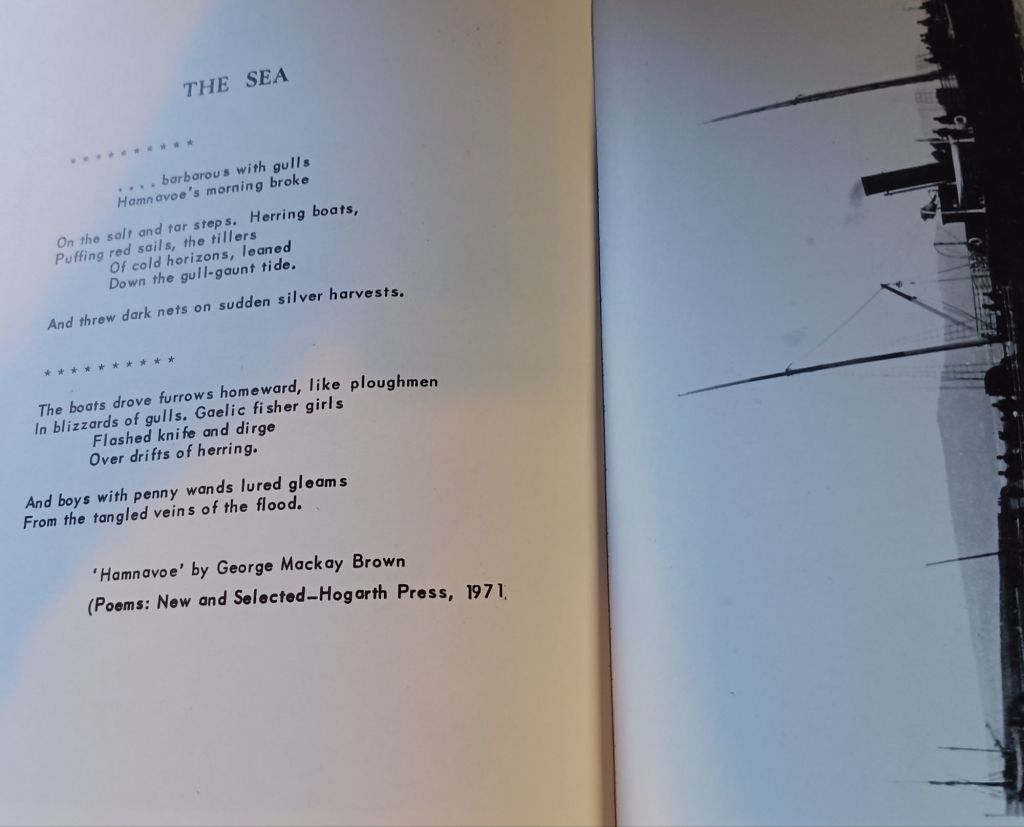 Towards the end of the whole book is this poem excerpted (from Hamnavoe – his song of old Stromness well before the Victorians). The poem is set against a picture of a modern steamer transport ferry:the very opposite of the medieval craft in the poem.