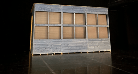 Even when moving two-dimensional figures are projected on it, they look three-dimensional because the relief of the ‘shed’ wall (the set) is three dimensional – a wooden frame – blue in natural light, but not always in such light so transitioning constantly – with gridded squares that acts variously as ‘glass’ windows through we see into an interior (of a room of differing kinds), or portals between the imagined interior and exterior space. Blinds are pulled down across the open spaces on that can be pulled fully to make a blank if uneven space or projection (with three dimensional characteristics when the whole is used. They can be pulled down partially to isolate some spaces. In the second act story. The left and right panels are made to represent the two isolated flats in which each ‘lover’ lives until they form a romantic and sexual relationship.