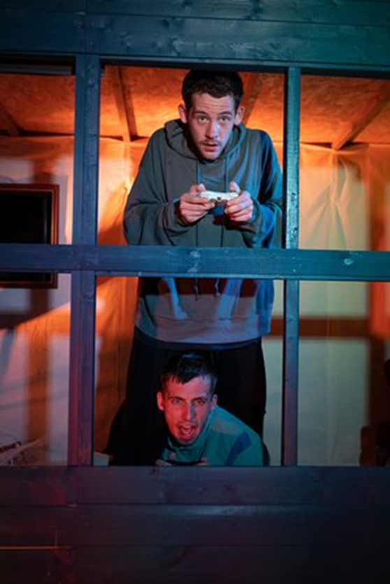 So why do we need to see this whole work in three clear parts, with three stories as one. I think that is, in part, because the work is about the fragmentation of experience and about the slippage between interior and presented meaning. The first story opens with a young man trapped in the ‘shed interior’, his bodily movements, in the form of jerks made rhythmic by skilful crafted repetition as dance, occluded by the set wall and the grid of its windows. He is variously living out the chaos of a disrupted life, animated by the throwing about of littered clothes and bins of debris – beer cans – that speak of the disorder of his life. That he appears to attribute to the loss of his male friend who has gone to university, although expected home. That colleague is, even on return never confined to the interior of the set. He enters externally and even uses his exterior positioning to engage with the audience as if participants in the clubs he has attended with the boys.