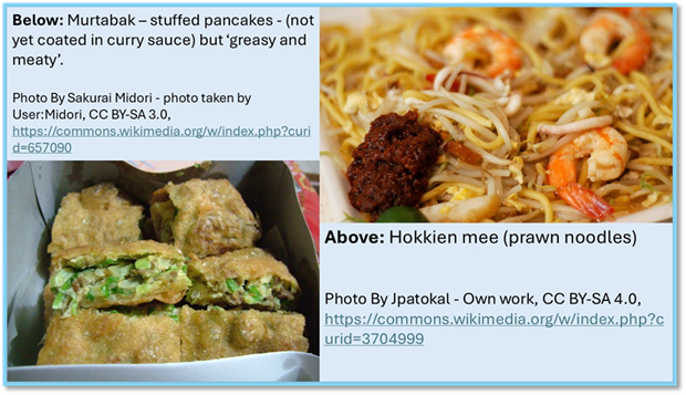 In the novel’s symbolic structure, hungry desire for food, and acts of eating, matter a lot and have resonance not only with fuel for human growth, but the psychosocial nature of that growth. What to Jack Lim is ‘peasant food’, and yet ‘good for you’, is ‘fit for Emperors of China’. To Fong. The half-brothers play out the debate as if it were about the values associated with high and low status and the mix between them that explains their accidental genesis from one father from two mothers of differing class.[9] Fong remembers the young ‘lean, ravenous version of the twenty-year old’ Sui, Jack’s wife, as ‘always hungry’ even whilst Sui herself wonders how her ‘different metabolism’ then grew into the woman who sits emotionally and socially starved with her husband Jack, Fong’s brother, with whom she sits ‘through dinner in silence’.[10] In the same way Jay sees Chuan in terms of a man coming into being on the food of the classes for whom fine dining is alien. One superb scene takes the lovers through a gargantuan meal of ‘greasy and meaty’ street food. Chuan opts for murtabak. Jay pretends to demur about the excess of food to appetite. Nevertheless, he eats as much as Chuan and even licks curry sauce from his hand, though he is also pleased that Chuan buys him tissues in register of his delicacy of educated taste: Chuan –