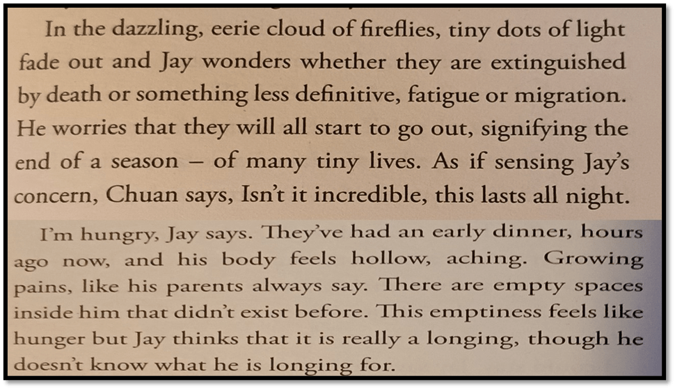 Aw writes, with great finesse, of a moment of heavily interpreted sense perception that leans towards the making real of the emotion accompanying endings – not just death but ‘migration’. It is as if pain is rendered into an element that can be directly perceived when that pain is moulded by concepts and developments beyond ourselves, like the movement of global markets and the power of social ideologies. But whose point of view sees these psycho-global events in the fading of firefly lights? The prose is ambiguous. The whole is definitively written, and we remember the author is meant to be the elder Jay, as if ‘Jay’s concern’. But that conditional sense– that ‘As if’ – is interesting because it implies either that Chuan also sees as Jay sees, despite the constant reminders of his difference from Jay, or that his care for Jay sees the equivalence of threat to their love in Jay’s abstraction. This is great writing.