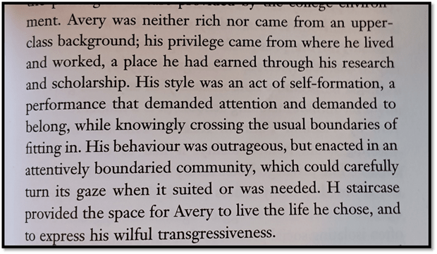 Goldhill tells us that Avery offered care and support, putting him to bed when frail, to fellow Fellow of the college Edwin Morgan (E.M.) Forster. That is beautiful but not the tone of the man I briefly met. The man I met is much nearer to the description from Goldhill given below – a man who took advantage of obscene privilege and did not much care about queer men outside the college environment except in those ordered in like the rent boys Goldhill mentions. But what I do remember was that Avery was dismissive of any other but sexualised experience amongst queer men and that reduced the scope of liberation to which I and many others, not in privileged classes or privileged by institutional power, had available to me then and for too long later. That applies to all of the young struggling queer men I knew in the period. Not all of the latter were victims but some were. I count myself then as that but do not count myself thus now. Goldhill is brilliant on the privilege of Avery. It was won by merit but used as if merit no longer mattered, only the security offered by a two-faced status quo that looked after its own (those withing the ring of its institutional defences) and scapegoated the rest.