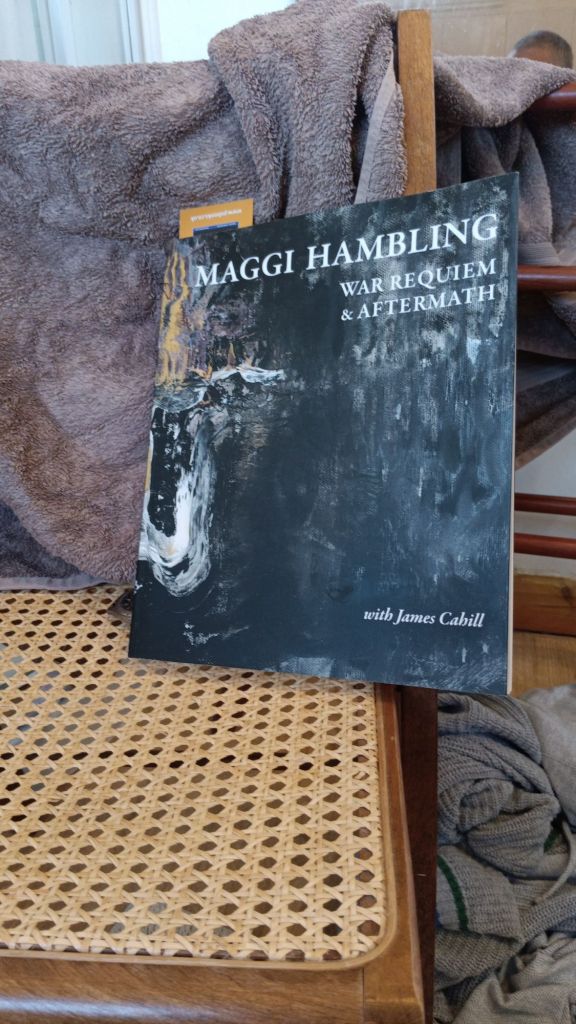 But now Cahill’s words, innocent or intended to mean just simply what they say and no more, have touched again on my disordered life. I was finding it difficult to to read the novel – though I have deeply admired its prose and its management of the interaction of characters and events – and this is because I could not get past pondering about its rinted dedication: ‘For Maggi Hambling‘. As friends tell me, the artist Hambling is a ‘force of nature’ but I could not rest at that. That is a laughable enough trait in itself. But this is particularly so though for yesterday I came across, in my cataloguing venture above mentioned a book Cahill prepared with Maggi Hambling on her art-pieces War Requiem (a reflection on Benjamin Britten in part) and Aftermath. I do not believe in the agency that might lie behind coincidence but I still felt compulsion to read the book now, possibly for the first time – I can’t remember – before returning to the novel. Hence, before I could continue reading my novel, I ensconced myself in my bath and read through that book about (and in collaboration with, the extraordinary queer visual artist, Maggi Hambling.