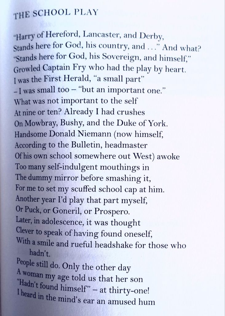 Captain Fry, merely asserts his knowledge but young James has ripped the heart of Henry Bolingbroke and shown that his first duty is neither to God and his sovereign unless that personage, by assumed divine right, is “himself”. And thus it is, the poem suggests with all performance values wherein individual persons learn by ‘heart’ the part they must have (or so they feel) in the the world as it is currently after the ‘small part’ of a boy – the major part of a MAN, with all its ideological trappings, thought necessary to the adult male role scripted by heteronormative sexism, and indeed other norms. And why not the poem also suggests have not one man in min, even at that age but ‘crushes / On Mowbray, Bushy and the Duke of York’. We can see a similar theme in other half-dramatic poems in Merrill.