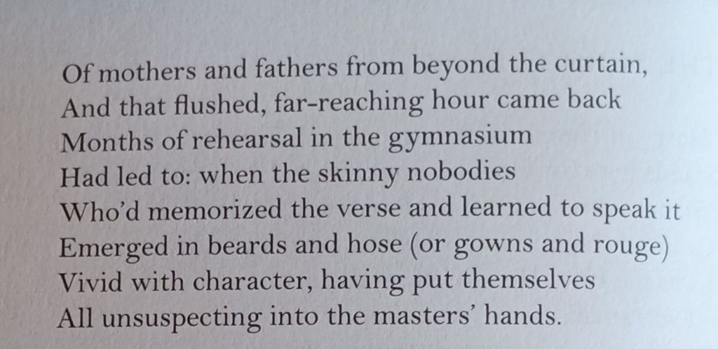 This section of the poem turns on itself. After all boys become men by practising that role in the gymnasium – the classical model of that had long tentacles – and Merrill is pointing to how boys become socialised into male body forms. However as the sentence proceeds we realise he is not talking about the gymnasium not as the abstract concept of male training and rehearsal for manhood selves but the place where the school play Richard II was rehearsed (the play itself a tissue of contrasts about the acceptable and unacceptable in male sex/gender roles if not as radical as Marlowe’s Edward II, where the King is not just a soft man but queer with it (an open question in Richard II).