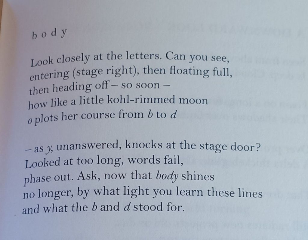 I could spend the same number of hours as my age in years parsing this beautiful poem, which seems to me a uniquely modern metaphysical poem, obsessed with deconstruction and associative contexts in competition. About birth and death (b and d), it explores the vacancy indicated at the centre of ‘o’ and shows that in a poem a body can both shine and then not shine, perhaps simultaneously but at last in the slippage of meanings across a poetic enjambment:
