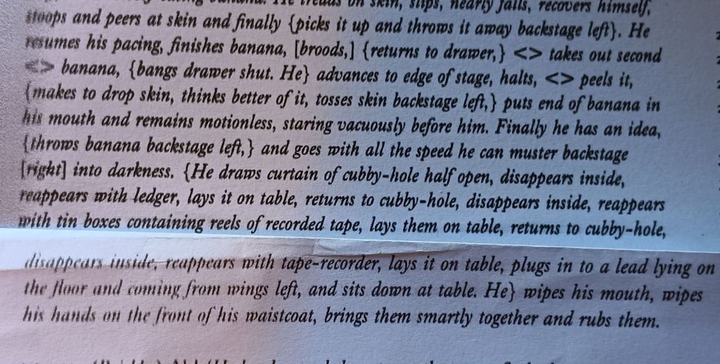 Of course we are not comparing like with like but the changes to the words based on Becket’s production of his own play means that if in a Becket play it is true that ‘every detail’ is ‘ integral to the meaning, particularly costuming, lighting, sound effects, and gestures’ unless we accept, as I do that a production can freely change the configurations of details precisely to show changes in the nuance of meaning required in each production based on lots of factors, including the contribution of the actor playing the older Krapp and also the younger ones recorded, in the fiction of the play, on spools of tape-recordings. There are obvious details. The drawers containing the banas are no longer locked and therefore require no keys, a piece of business Gordon aligns with the bananas to indicate the onanastic in Krapp’s character. In 1969, there were no keys and the business with bananas was much reduced and changed in tenore, reducing its clown-like character a little. The set was used more specifically with additions of motion to the right and left of stage as well as movement backwards and forwards from a central pool of stagelight. Lighting too then takes more nuanced meaning in 1969 to add to the mass of references to that contrast in the play – in spoken text and staging directions. This includes some favourites of mine from the standard printing of the Faber & Faber text, as here, where Krapp: ‘goes with all the speed he can muster backstage into darkness’. In the 1969 Knowlson text this becomes ‘goes with all the speed he can muster backstage [right] into darkness’. What is added by that right move, especially since the furnishing on stage has changed and been added to. Instead of ‘darkness’ alone hiding the business Krapp wants to be secret, he hides it in a reall structure built on stage: ‘a cubby-hole’.