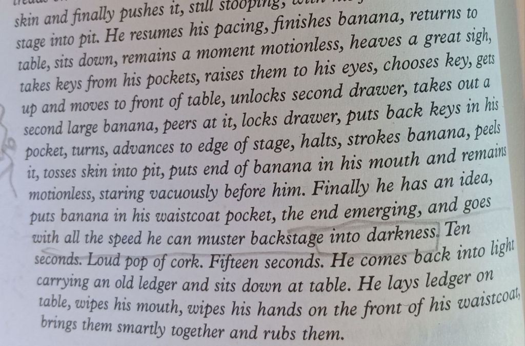 With this any scholar of theatre might agree but it leaves so little for the actor-director to add to the text. To reproduce Beckett’s own practice is impossible without realising that Knowlson has truly proven by revisding the original text of the play as it would be following the 1969 German production. See these two versions of the same stage direction from the Standard Faber and the Knowlson text below: