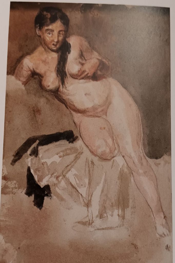 This is perhaps one of the finest sketches of embodied auto-eroticism available. Shading and colouring all contribute to the gross shaping and out-fleshing of the body, even the fall of hair between the breasts. The cupping of the breast is sensual because the hand is felt to touch the nipple, the touch even shaded. . This woman may look outwards but her gaze is amazedly internal or at a mirror – , her joy is in the shedding of the rather fine dress beneath her. We are tained top see such pictures as heterosexual male fantasy, but how much can that be justified, for this picture comes from painterly work not fantasy, it loves the body as only the person in it could so fully.
