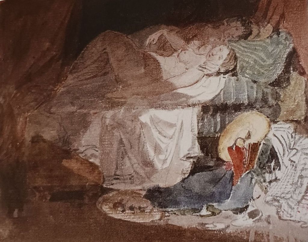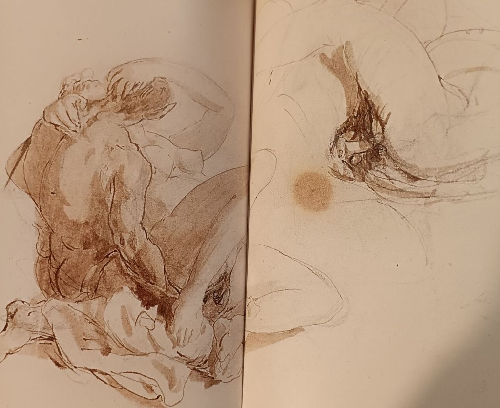 But we make this assumption at our peril. Indeed, not all the graphic work exhibited in this book, all taken from the sketchbooks Turner used to capture the imagery that he would later use in his paintings, can truly be said to be ‘secret’ or intended to be such. For instance, take the famous watercolour from the ‘Swiss Figures’ sketchbook. Warrell describes the picture as a response to the sexual freedoms Turner at the age of 27 discovered in his travels in Switzerland. Warrell admits that it is not easy to describe the figures on the bed , even indeed down to the sex /gender of the figure at the rear, who is obscured either by the fall of the lighting represented in the room or by a deliberate artistic methodology. Nevertheless, from the off Warrell sees the picture as of ‘two figures, apparently in post-coital abandon’. His later comment about the pale figure nearer the ‘front of the picture that her ‘hand seems to caress something – perhaps his penis’ shows he has little truck with the idea that there are two women in bed here.[1] A rather different view is given of this picture by Turner’s intelligent 2016 biographer, Franny Moyle. She finds ‘post-coital’ atmosphere here too but does not assume is coitus that has been performed by or just by the two figures. She thinks it may be possible that after thruple-sex with the two women represented here – prostitutes – Turner has slipped out of bed to draw the remaining persons, to their delight (or has imagined such a scene).