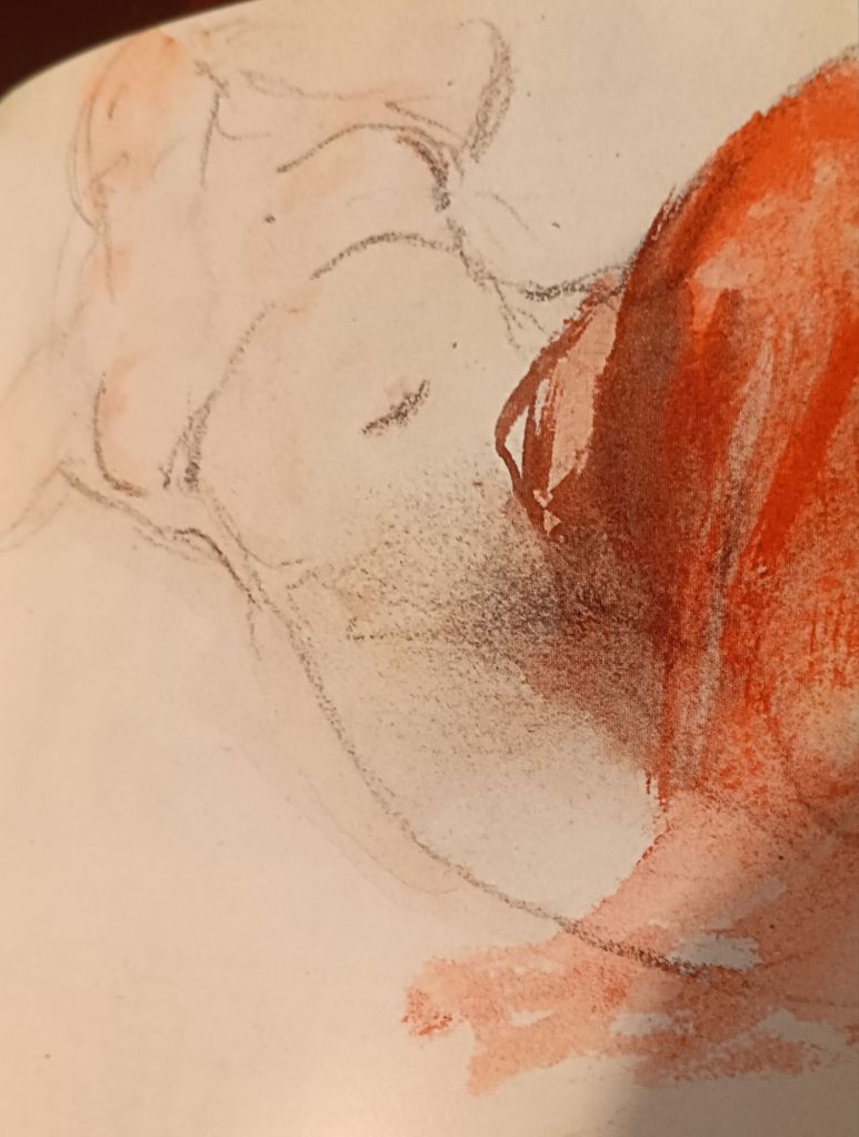 As I look through these sketches again, I feel Iurner working with paint inventively, especial in the range of reds, pinks and vermilion, and almost abolishing the delineation of body limit for fleshly feel that even inhabits the background wash below. Colour and omission of any marks in focal spaces, in a body that grows to the impossible size of its desire and yet is constantly penetrated, as if, autonomically (as an involuntary act of self-desire in which the gaze of the other can be eliminated).