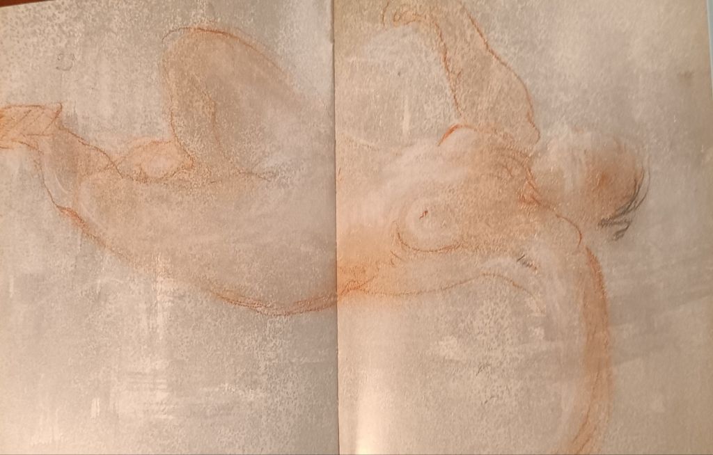 Turner seemed to interrogate figure and background, often in what seems as his fascination with breasts, which are drawn with the right breast falling, the left more alert. The writhing motion of the legs and the intention in the arm obliterate the head of this woman, and yet no object of passion but the subject’s own body exists. here, for too long we have intuited male gaze. My queer women friends have too often corrected me on this assumption. However, this is not the best example for my point, for sometimes I see evidence of a head about to lay itself on this figure’s lower torso and kiss it, as a ghost might.