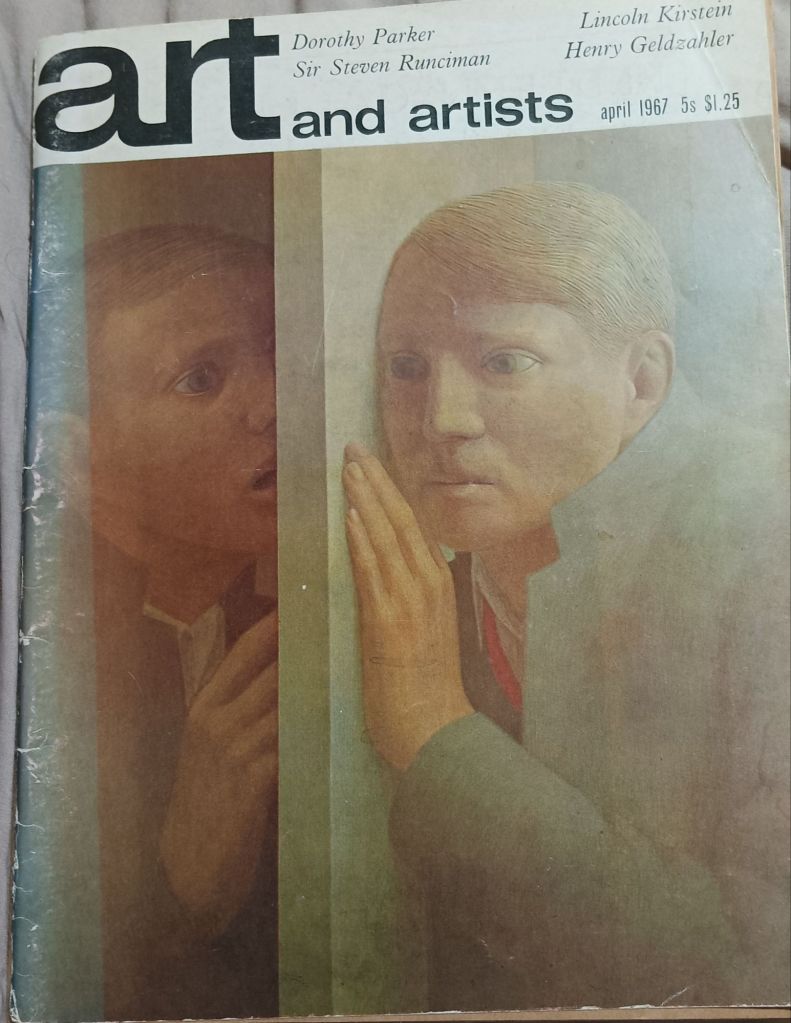 I have to admit that this blog came yet again from my cataloguing exercise. I have reached a stash of books to sort in our conservatory, They are a kind of shrine this section to my love of Byzantine Art. Nestled amongst these books was a copy of the American art magazine [pictured above] art and artists from April 1967.