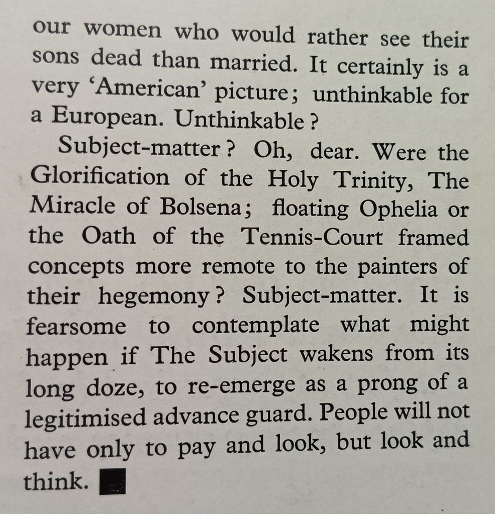 Kitstein must have represented many of us who failed to see the appeal of abstraction as an alternative to everything thought of as ‘literary’ in art: the representation of figures / persons, narratives and symbolic or iconographic prompts to thought. In short he meant the art that had a ‘subject matter’. Hence, his final paragraph, which takes off after his attack on Momism: ‘moms’ or –