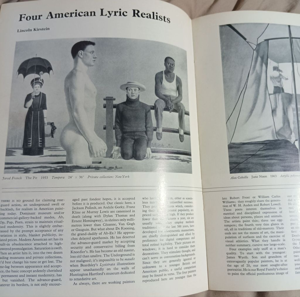 The British examples I give are of queer men, as Kerstein does of his Americans, without, as I do, any vulgar breaching of their closeted framing. However, queerly enough, Kirstein’s choices are successful examples of narrative and figurative art that Lincoln lauds and who were also queer men [men fluid in their sexualities and not looking for any one label too soon] who were well known to him personally and bisexually. I will confine myself to three of his chosen heroes. He describes their tendency in an early part of his essay shown below in my photograph of it: