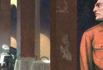 Any viewer’s gaze will almost immediately rest, in viewing this painting, on the figure of the hyper-masculine, in body at least, American G.I. However, he does not return our gaze, which seems directed back into the depth of this townscape onto a slim young woman serving tables in the cafeteria behind him. Or is the actual goal of his pwrfprmative gazing.