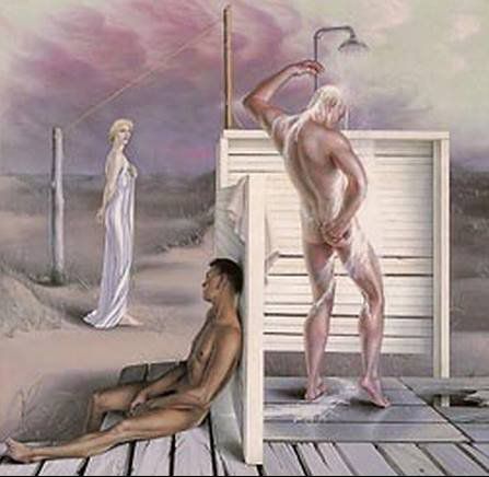These photographs are clearly articulations of desire through empathetic exchanges of the gaze and sex/gender boundary crossing. It makes the painting below by Jared easier to read, if still mysterious with regard to what is an interior or exterior image of our desire and identification. The subject of these paintings was often narcissism as the subject/object of thought.