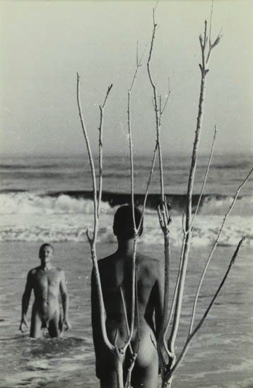 The book is rather shadowed by the come-to-bed eyes. Had their photographic art, mainly fired by Margaret, been available to us earlier – they made cards of them to give away at Fire Island queer parties – the code of their paintings might have been easier to break. Consider this full frontal Fire Island beauty of Margaret’s: