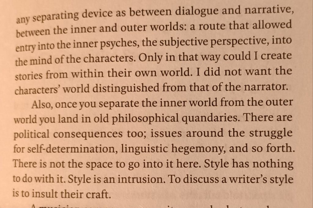 3 thoughts on “‘I began doing away not only with quotation marks to distinguish dialogue but any means at all of distinguishing dialogue from narrative’. No words that matter in the way the question suggests can really be called a ‘quote’.”