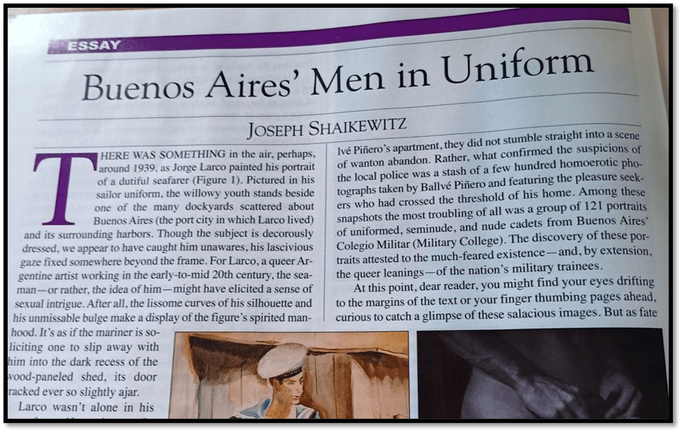 Instead I became interested in the meaning of queer art history and queer art criticism – how it signals, for instance, the evidence that makes it differ from academic art history of the ordinary kind, even where it is not (as most of it is) doggedly heteronormative. Hence i wanted to look at HOW the writer ‘reads’ the art of Jorge Larco, not only as art but as queer art with perhaps a different training of the eye behind it for the iconography and other coded languages of visual art. Let’s take, whsat he has to sat about the painting Marinero (1939). I cite Shaikewitz in the collage below, but not the part that triggered my interest in the kind of licence that queer viewers might take in interpreting this picture. For instance, he ”notices’ with respect of the sailor in the picture ‘his lascivious gaze fixed somewhere beyond the frame’. I just don’t see the painting thus – I cannot ‘see’ what in the gaze of the sailor is ‘lascivious’, nor even that its object is necessarily ‘beyond the frame’. What in there characterises the gaze as ‘lascivious’ other than some projected interpretation of his pose, stance and the suggestive, almost fashioned, dishabille of his clothing, especially that open collar. The arm gesture seems that of the teapot pose that has characterised queer men in art from the eighteenth century, but the eyes themselves could just as much, from what we see, actually show the absence of either focus or motive in the sailor’s eyes, as if he has taken up his pose in a mood of pure boredom at the exigencies of his life – often involving selling sex for money in the period, rather than looking to satisfy his own desire. The citation in the collage seems nearer the point. Here it is again with it explanatory prefatory phrasing: