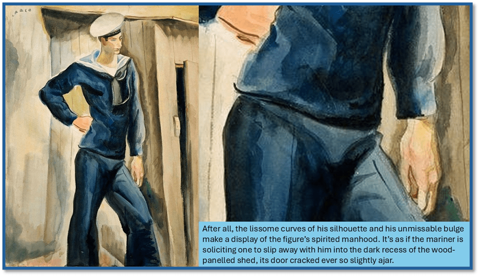 … the seaman – or rather the idea of him – might have elicited a sense of sexual intrigue. After all, the lissome curves of his silhouette and his unmissable bulge make a display of the figure’s spirited manhood. It’s as if the mariner is soliciting one to slip away with him into the dark recess of the wood-panelled shed, its door cracked ever so slightly ajar.