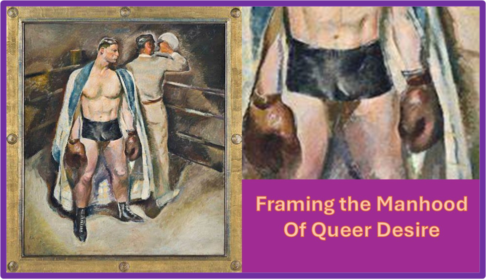 For instance, let’s take another painting by Jorge Larco, which shows a male with an ‘unmissable bulge’ but not one protruding from a tight uniform. The bulge is even more unmissable than that in Marinero, and, although it is, none the less, a total illusion of light and shadow that produces the look of volume and depth in tne boxer’s shorts, it is the more skillfully and, from distance, realistically done. But that protuberance is framed by huge bulbous boxing gloves that defend that which they frame. These huge hands are made the more forbidding and alien by the size of the gloves, and the fisting of the one on our left. My point that to paint the object of desire is to paint also the object of potential threat and that that challenge is painterly and not just the reality of repressed lives.