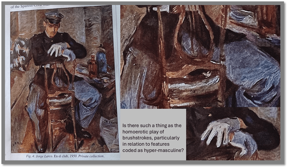 Sometimes the threat is more sinister, as in a beautiful painting picked out by Shaikewitz by Jorge Larco En el club (1950). Here desire is a very painterly and aesthetic product. in my collage below I caption it: ‘Is there such a thing as the homoerotic play of brushstrokes, particularly in relation to features coded as hyper-masculine?’. What I mean by this question is to draw attention to the play of brushstrokes that comprise this military man’s trousers, so extended and enfolded that his legs are massively the centre of attention. The swirl and mylti-directionality of those brushstrokes catch the eye and absorb the interest of the viewer and blur the boundaries of the thing painted, especially in the leg on the viewer’s right. And then the crotch area where those playful strokes are mirrired 0 they lie within the gap formed by the splaying of the dark blue military coat and are seen through the orphean lyre back of the chair he straddles, perhaps even rides like a cavalier. The crotch area lies just behind the represented ‘strings’ of the lyre on which Orpheus might have played such music with his subtle fingers.