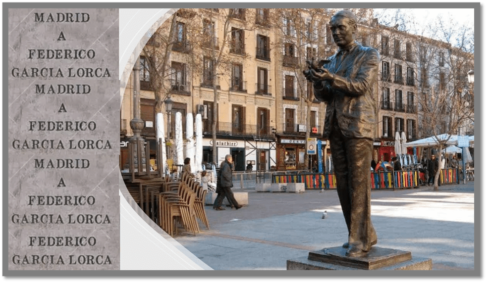 What I sense, that isn’t quite what Shaikewitz does, is that desire is complicit with threat in the very image and the process of its own making that it lays open to the eyes – painterly plat held back by imagery of constraint. The men of the period Shaikewitz deals with would entirely understand the game they play of flirting with the masculine images they also feared. Such a tension is highly present in the poet, Lorca, who visited Larco in Argentina. In earlier blogs (see the one at this link) I have shown the tension Lorca felt about sex-role playing in male desire, even running to despisal of feminine males, that must in part have been imposed on his psychology by the male culture about which he is so ambivalent. Yet poets must show sensitivity, however feminine the culture brands such displays, as might be seen in the poet’s memorial in Madrid: