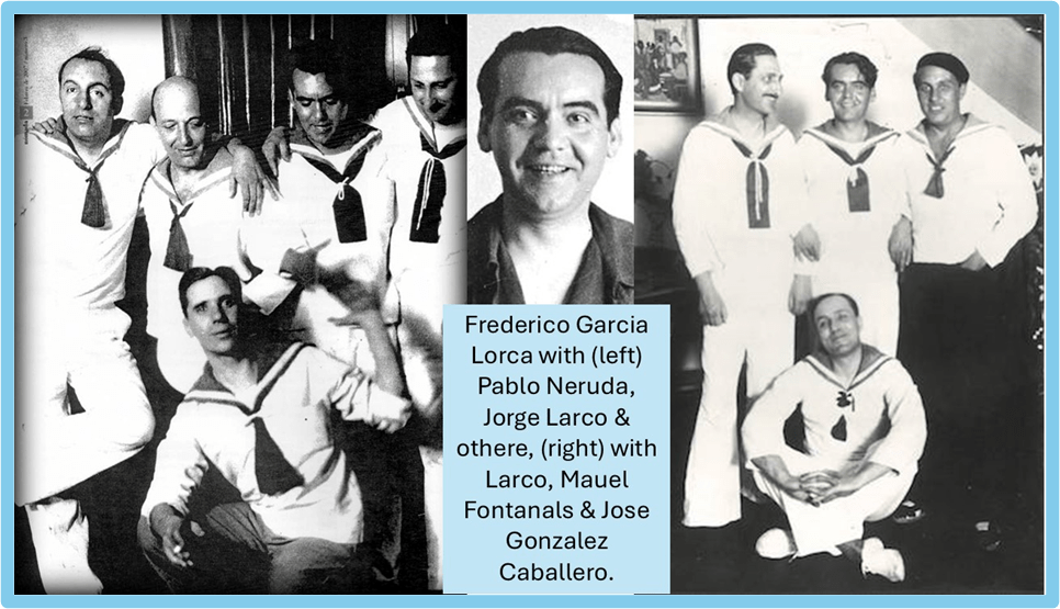 But Lorca too played the masculine game with his poet comrades in South America (even I was surprised to find in the photograph below – the other (right in my collage) than Shaikewitz uses in his essay – Pablo Neruda). The camp gathering of male poets and artists below in sailors’ uniforms (none of which are but a theatrical costume) shows that queer men oft controlled uber-masculine imagery by ‘camping it up’ (see my silly blog on this).