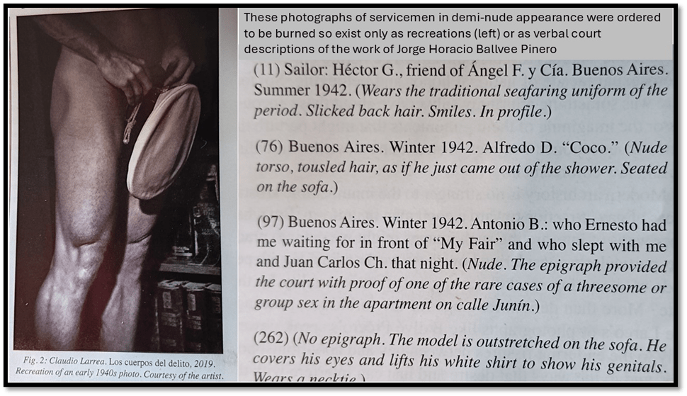 But there is also a sense – clearer to men who had sex with men in the time of these queer men, that uber-males too were as happy to not be confined by binary labels of gay and straight, homosexual and heterosexual, though perhaps less flexible with the more entrenched binary male – female. Shaikewitz instances the photographer Jorge Horacio Ballvé Piňero. His photographs exist now only in recreations by later photographers done from court descriptions by the very court, unwilling to show them to jurors, had them burned (some of these from Shaikewitz’s article are in the collage:
