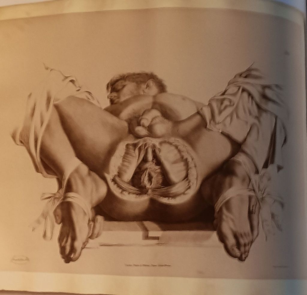 Again, the head of the male figure feels to be that of a living, if passive, man. The otiose display of the ligatures used to display the corpse model for demonstrating the precise area of the body is not only unnecessary but interacts queerly with the sense of life in those parts of the body not open to internal view of the body. But the focus of the picture on the open anus capped by a significant mound of external features of the genitalia, seems to make it, in Sappol’s account, ‘utterly indifferent to to the policing of representational boundaries that protect the category of Beauty from things like exposed rectums, testicles, viscera and anatomical destruction‘. Instead, Sappol goes on to say: