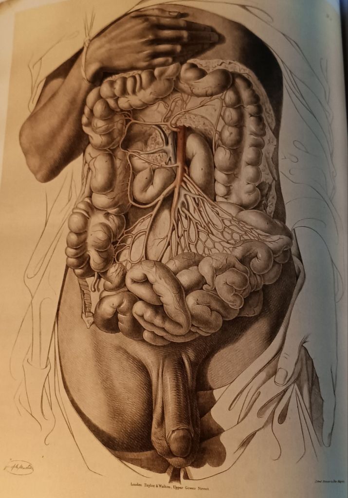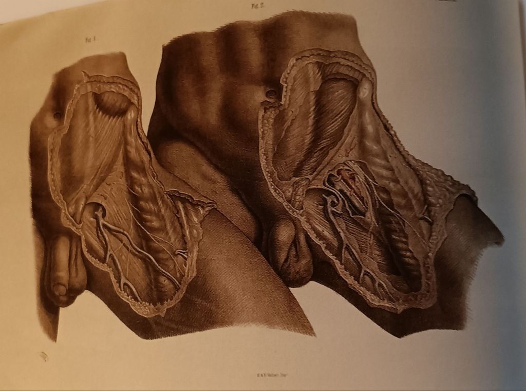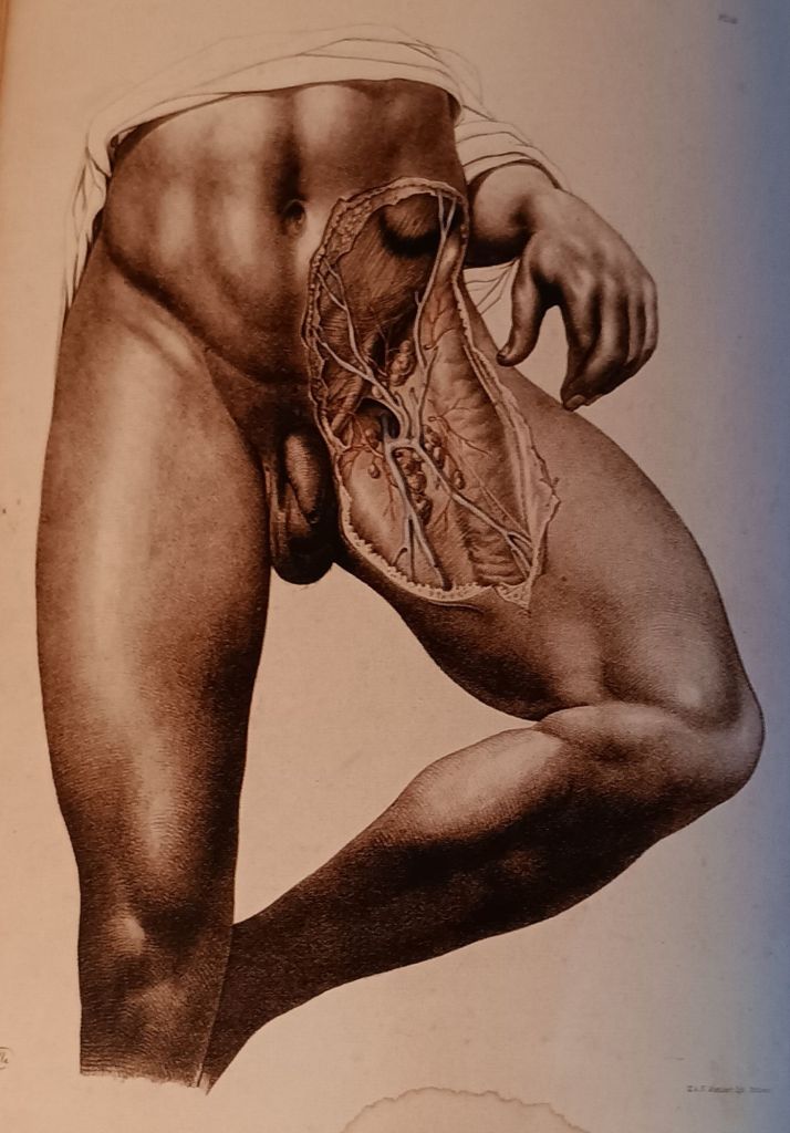 These are clearly different men and we know that mainly because of the distinctness of each of the men’s penises. At the time of publication (1856) an expert reviewer, from the Edinburgh Medical & Surgical Journal, complained of “the crowding of two anatomical figures on the same page’. Sappol wonders out loud that, though for a physician comparing examples of varied levels of anatomical depth in a ‘close pairing makes the comparison easier to see’, that perhaps the reviewer became uncomfortable, since strictly speaking the page is not ‘crowded’, he sensed that these figures positioned thus also gave play to ‘an opportunity to stage a teasing contact between bodies’ (Michael Sappol (2025: 122f.) ‘Queer Anatomies: Aesthetics and Desire in the Anatomical Image 1700 – 1900’, Bloomsbury ). Who am I to say, except that the picture gave me pause even before I read what Sappol had to say of it.