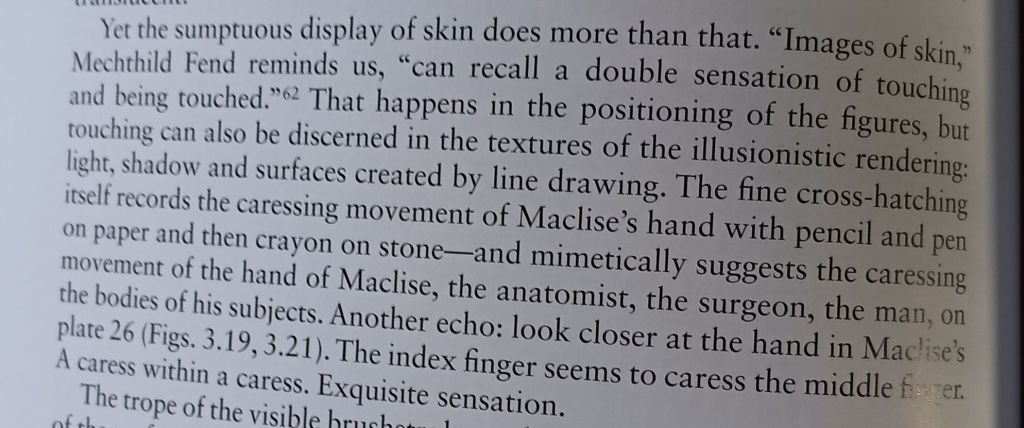 Those orphaned phrases, bereft of the authority of a parental sentence, like ‘Exquisite sensation’, are characteristic of Sappol’s queer style but I find them very effective. This seems to me art critique of a very high order, for it takes us back to the work and we see what we might have missed – in the totally redundant characteristic (for an an educational anatomy book) even of the self-caressing fingers of one hand, and would have been the worse for not noticing.