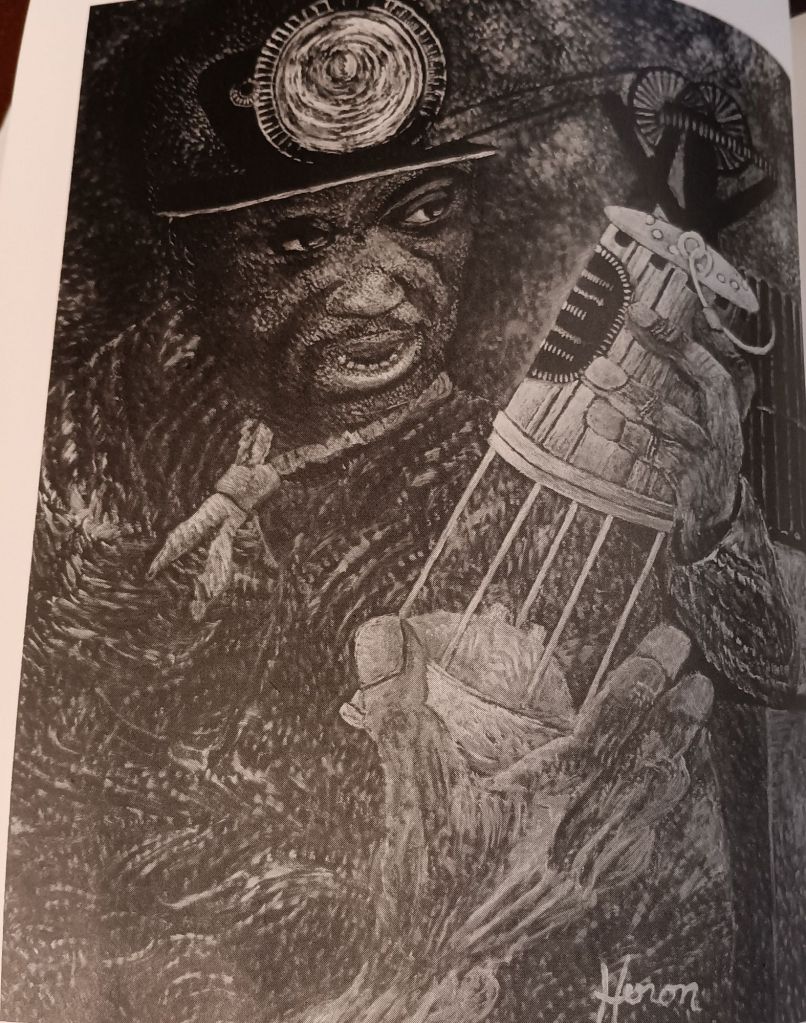 Perhaps the most interesting piece however returns us some features of mining communities that feel anachronistic. In the picture beow, a miner with a modern helmet lamp investigates a Davy Lamp., which unlike the helmet lamp does not appear to be lit. Gayle Lisgo gives a great description of the picture, ending it with: ‘He is a black miner’.
