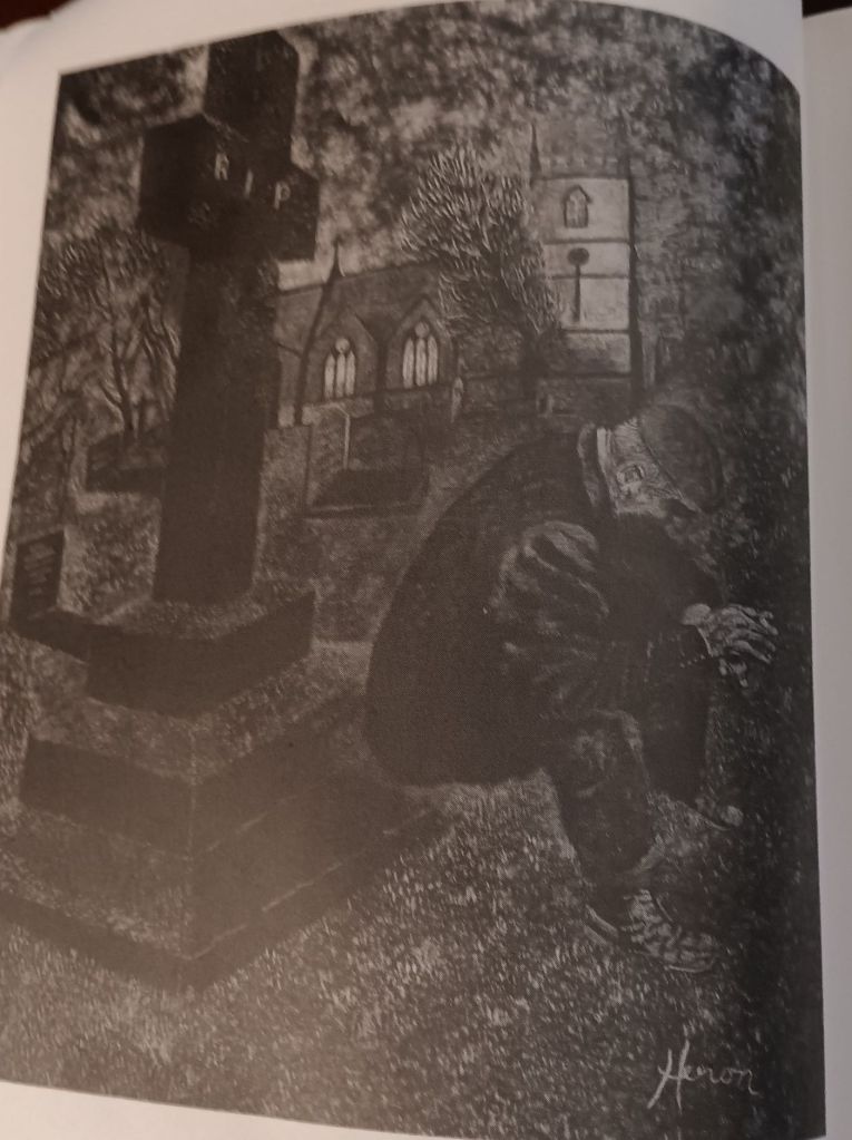 When it comes to adult sorrow, how might they deal with this, a miner sitting in the dark (it must be evening for the church windows glow) at a headstone marked RIP on which his back is turned. Steven Firby decides the miner mourns ‘his old friend, Tom’ and ‘the good times they had down the mine’: the mood about mining seems an elegy for a life already past.