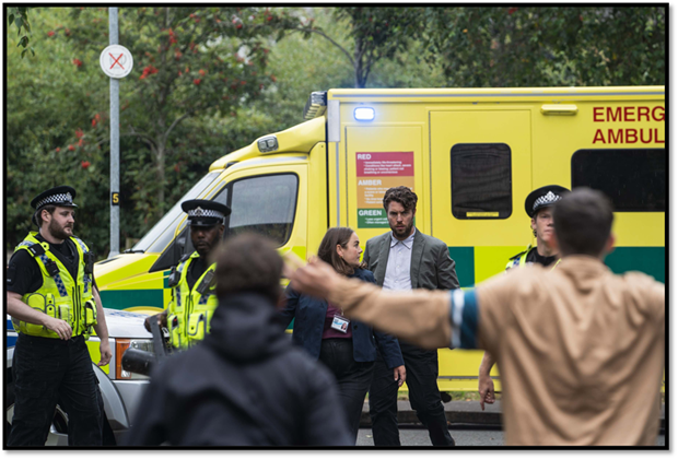 Meanwhile, the Trust has referred his practice to the Medical Investigation Unit (MIU), even taking that further when Ford tries to get more information from Hernandez and is charged (somewhat fairly) with bullying. He is seen by management – security guards being present. The Trust – presented as Yorkshire Health trust (YHT) – have him suspended with immediate effect and escorted out.