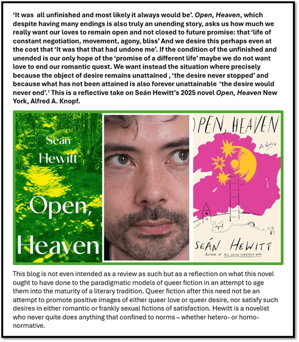 ‘It was all unfinished and most likely it always would be’. Open, Heaven, which despite having many endings is also truly an unending story, asks us how much we really want our loves to remain open rather than closed to future promise: that ‘life of constant negotiation, movement, agony, bliss’ And we desire this perhaps even at the cost that ‘It was that that had undone me’. If the condition of the unfinished and unended is our only hope of the ‘promise of a different life’ maybe we do not want love to end our romantic quest. We want instead the situation where precisely because the object of desire remains unattainable , ‘the desire never stopped’ and because what has not been attained is also forever unattainable ‘the desire would never end’.[1] This is a reflective take on Seán Hewitt’s 2025 novel Open, Heaven New York, Alfred A. Knopf.