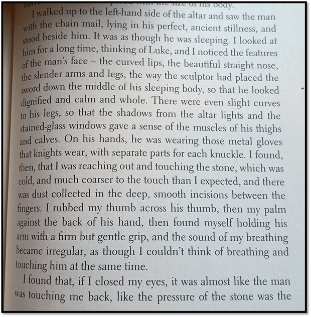 Such freedoms look very unlike freedom and when eventually Luke admits he knows of James’s love for him, he accepts it but only at the denial of any chance of realising together any act of sexual desire. And James must find himself satisfied by this perpetual denial of desire, and even introject it into his take on his future relationships, even with his unnamed husband. Strangely he completes the only love he might expect by virtue of imagined touch again but of the statue of a medieval knight on a tomb, whilst simultaneously thinking of Luke.[29] Whilst knowing the feeling that, unlike Luke, the knight was actually ‘touching him back’ was an illusion, which he explains on the next page as relates to his awareness of the coursing of the blood flow in his own hand, the completion of mutuality stays exactly where it is – encased in the cold stone body of the other partner, and giving away no future hope of continuing desire.