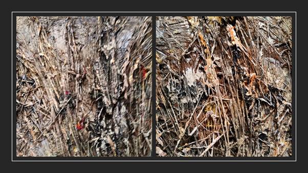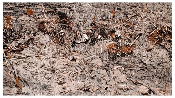Perhaps the most telling version of seeing that feeling of materials sticking in each others orbit is the wonderful Waldsteig Forest (2023) in which autumn falls as gold, like Zeus impregnating Danae (perhaps the most pernicious of the Ancient Classical stories of rape of the earth by power. It is huge (280 x 230 cm) but its layers almost make it thick, though that thickness when seen from its edge are not that of layered thing but things in a primeval chaotic but hardened soup, in which read dead leaves play a part as well as the material we call ‘gold leaf’.