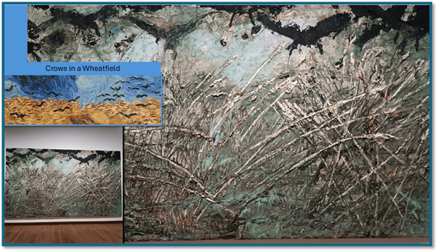 How much more might this be an issue in Kiefer’s version of Van Gogh’s Crows in a Wheatfield (1890: 50.5 x 103 cm) which is 330 x 570 cm in size, in which Van Gogh’s golden-coloured wheat takes the texture and look of lead in Kiefer’s painted dead straw. Kiefer tells is that he learned from Van Gogh that you need not think of Van Gogh as insisting on the real presence of a wheatfield in front of these paintings, but its rendering as a kind of composition of abstracted forms, especially in the birds, which are often little more than two chevrons of black paint. For Kiefer, Van Gogh is building a world that isa world of ‘struggle’: