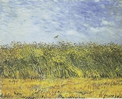 A simple three-layer composition: sky, wheat blowing in the wind, and at the bottom, a narrow strip where the wheat has already been cut. A lone bird in the sky hovers near the centre.[7]