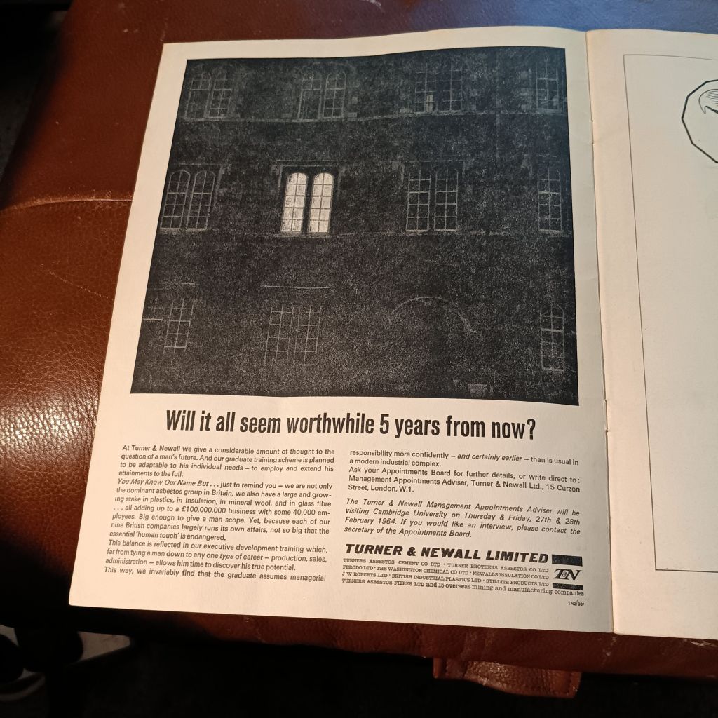 Tne analogy with Plath and Hughes is there, I think. And though this is pure speculation, how interesting a speculation about cultural artefacts otherwise buried. Granta was a magazine upon which, like the river that word once named, tragic things things better committed to its depths might float. Even at the time, advertisers in the real world saw it as a means of access to graduating people stepping out into high-flying but very ordinary jobs, ready to prove that burning the midnight oil was worth it, as implied in this recruitment advertisement for a construction company. Those readers of Granta, the company hoped, would set their value and that of the education they gained in the job market, in what Thomas Carlyle called the Cash Nexus of determining the value of persons.