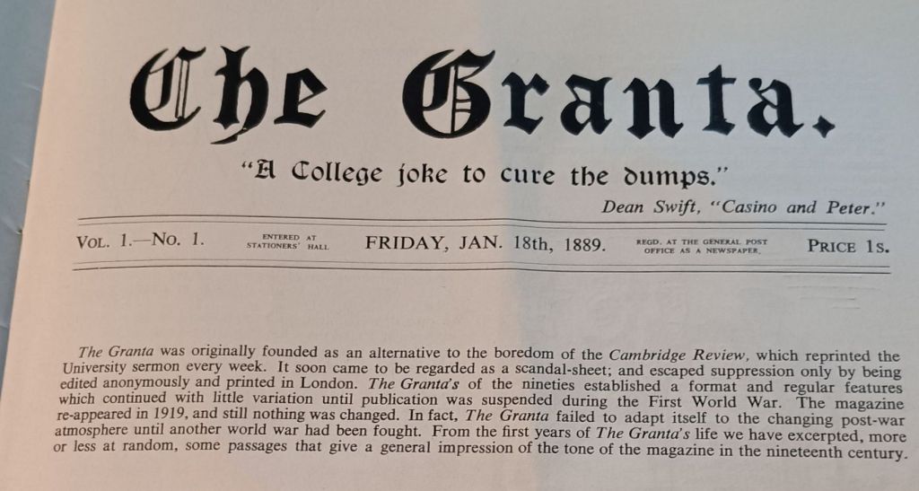 My husband Geoff is a bibliophile and is always on the lookout for bits and pieces of literary history that he knows will appeal to me. Recently, he brought home this rather special issue of a magazine with a long history and role in the mediation of artists developed within the institutional academic system, confined here entirely to Cambridge University. Wikipedia has the history of Granta, which explains the rather wonderful reproduction of the cover page of the 1889 first issue, which preface some very silly extracts from its early history. Wikipedia says: