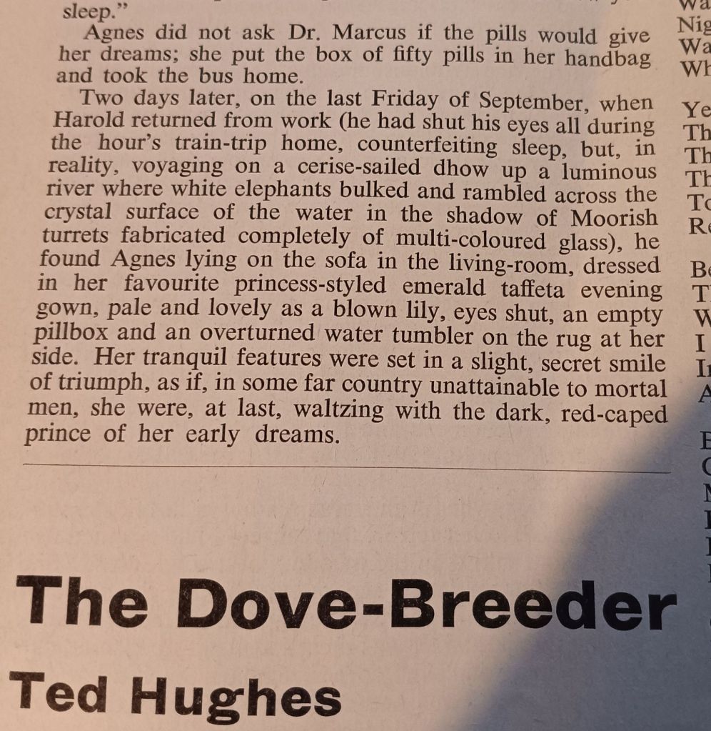 It isn’t a great story and a long way from the innovative and mature prose of The Bell Jar, but as a piece of writing about the folk psychology of suicidality and suicide, it is intriguing, if rather grimly so in a piece that presses upon the next contribution, Ted Hughes’ The Dove-Breeder, about a gentle man (as gentle as the doves he breeds) who finds love forces him to come to terms with what is ferocious in what he carries into the world of himself: