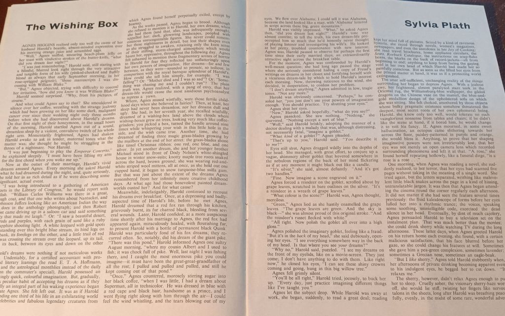 Other pieces are interesting, either because, in one case – that of Ted Hughes, they represent the quality of his entire work or because they are interesting biographically if not as self-justifying good literary works, like the story The Wishing Box, by Sylvia Plath.