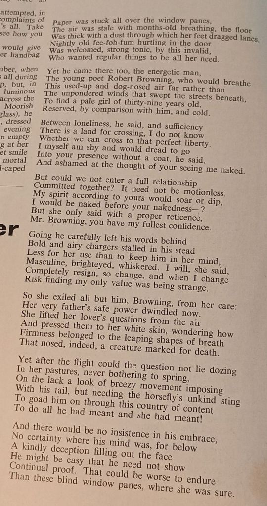 Inside her room, breathing its stale air alone and constrained to move through dust ‘through which her feel dragged lanes’, she could shut out any recognition of the world’s refusal of value by blinding its eyes upon it, it’s window panes, with paper. Thus was the effect of her poetry in providing a pretext for unwomanly strangeness. But Robert would expose her to the need for validation by any other measures, her verses given up in support of his energetic poetry.